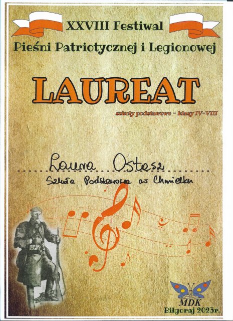 Niezmiernie miło nam poinformować, że uczennica klasy V - Laura Ostasz otrzymała tytuł laureata w XXVIII Festiwalu Pieśni Patriotycznej i Legionowej. Serdeczne gratulacje!!!