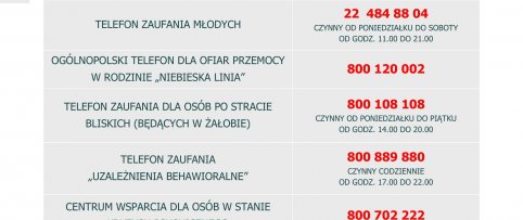 2021-11-04 Nowy numer telefonu zaufania - 800 12 12 12 Ogólnopolska infolinia dla dzieci i młodzieży oraz ich opiekunów POMAGAMY (800 800 605) od 1 listopada br. zastąpiona została telefonem zaufania Rzecznika Praw Dziecka. Nowy bezpłatny numer, pod którym dzieci i młodzież będą mogły otrzymać wsparcie psychologiczne, to 800 12 12 12. Telefon i czat internetowy będą czynne przez całą dobę, siedem dni w tygodniu. Czat nie wymaga logowania oraz instalowania żadnej aplikacji. Połączenia telefonicznie nadal pozostaną bezpłatne, a rozmówcy będą mieli zapewnioną dyskrecję i anonimowość. Wszystkie informacje związane z Dziecięcym Telefonem Zaufania dostępne są w poniższym LINKU: Telefon zaufania > czytaj dalej